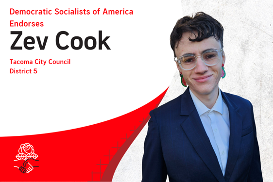 • Zev Cook is co-chair of the Tacoma chapter of the Democratic Socialists of America; both DSA’s local chapter and its National Electoral Commission have endorsed Cook in this election.