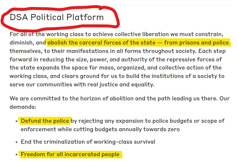 • These are also the demands from the DSA’s political platform, adopted at its 2021 National Convention: “Defund the police” and “Freedom for all incarcerated people.” This platform includes explicit demands to “Free all people from involuntary confinement” and “close local jails.”